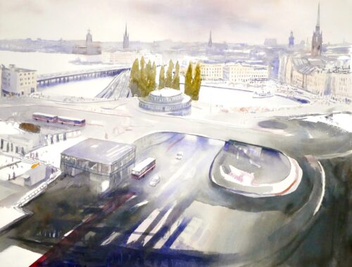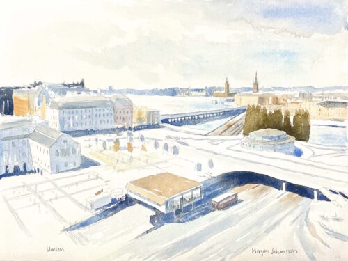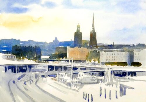 Jag behöver sällan leta efter motiv. Det kan vara storspovar vid fågelsjön, personer som veckohandlar eller stadsmotiv med något hus som jag tycker ser intressant ut. Jag tecknar och målar där jag befinner mig för tillfället, som dokumentation av vardagen. Jag använder oftast blyerts och akvarell.