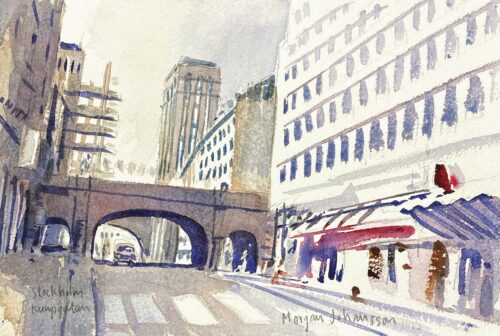 Morgan Johansson är en mycket driven och flyhänt tecknare och akva-rellist. Oftast använder han blyerts och akvarell. Morgan behöver sällan leta efter motiv. Han tecknar och målar där han råkar befinna sig för tillfället, som dokumentation av var-dagen. Det kan vara storspovar vid fågelsjön, personer som veckohandlar eller stadsmotiv med något hus som han tycker ser intressant ut.