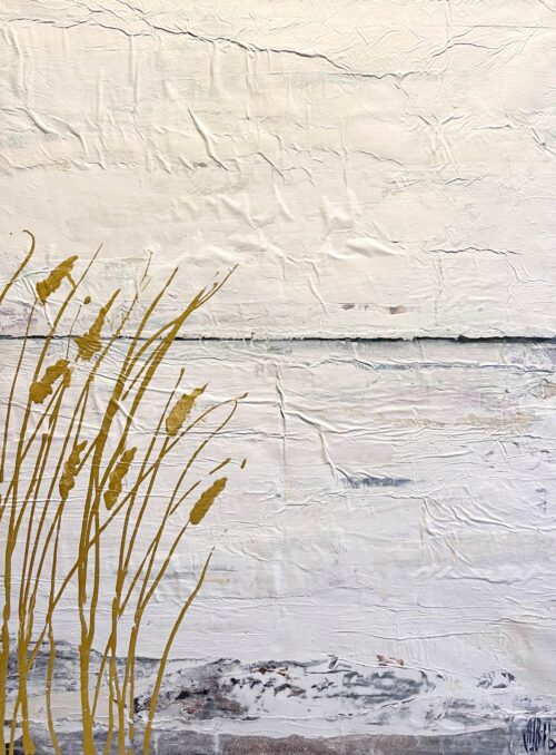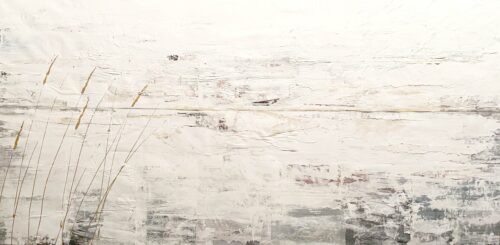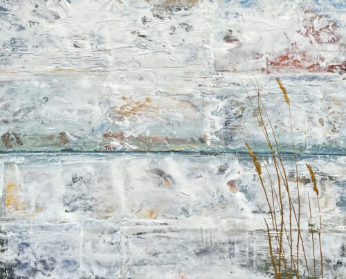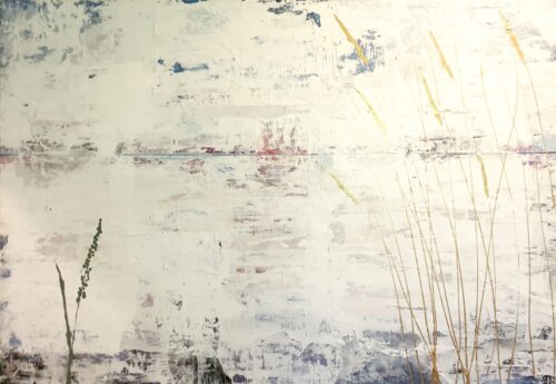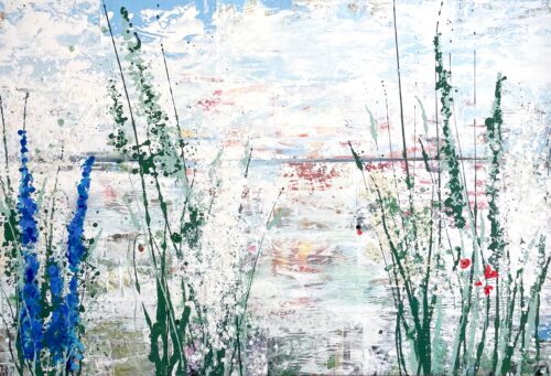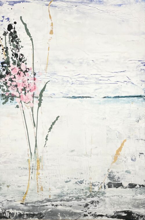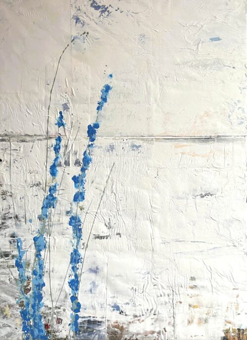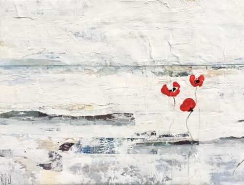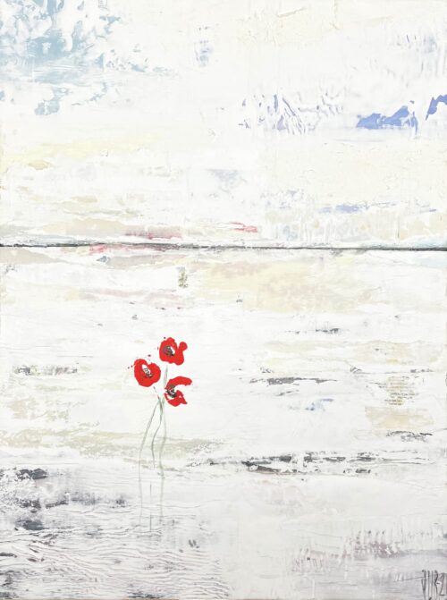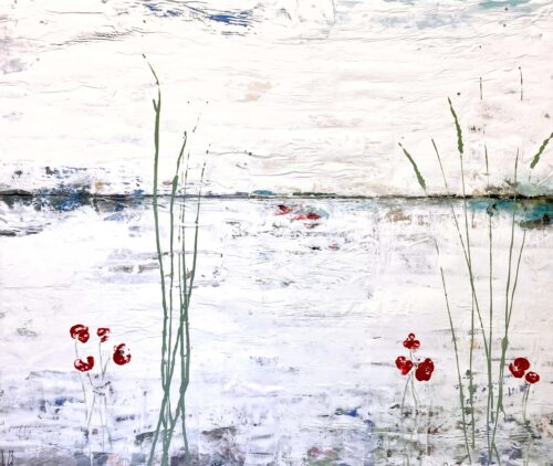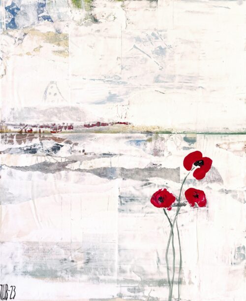 Johannas målningar har en alldeles egen struktur. Hon bygger dem omsorgsfullt lager på lager. Först limmar hon upp några tidnigssidor eller bilder. Sedan går hon på med ljus akrylfärg över duken så att den blir till en yta som skrovlar och buktar. I glipor skönjer man text-och färgfragment från det undre lagret. Och som kronan på verket stoltserar i all sin skönhet vallmon, en vassrugg eller rönnbärskvist.
