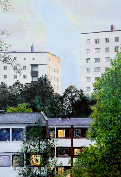 Över alla Jonas Beckmans målningar vilar en suggestiv, närmast filmisk stämning. Som om något snart ska hända. Här, i det som är så välbekant, på den anspråkslösa gångbanan mellan husen i bostadsområdet, ska något hända, eller så har någonting redan hänt. Men undran består; vad kan det vara? Som betraktare kan vi endast lämna resten av berättandet till oss själva.